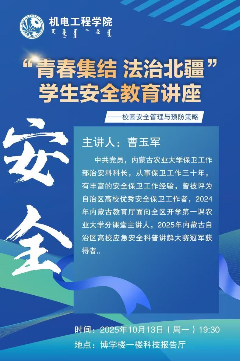 为落实学校2025年“青春集结 法治北疆”青少年法治宣传教育系列活动要求,全面织密新生入学安全防护网,帮助新生拧紧校园生活“安全总开关”,10月13日晚,机电工程学院举办新生安全教育专题讲座。邀请学校保卫工作部治安科科长曹玉军做专题讲座,2025级全体新生参会,讲座由学院学生工作办公室副主任毕力格图老师主持。
