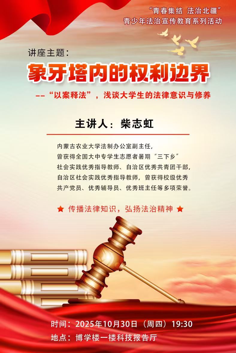 为扎实开展2025年“青春集结 法治北疆”青少年法治宣传教育系列活动,普及法律知识、弘扬法治精神,我院于10月30日晚,邀请学校法制办公室副主任柴志虹老师为同学们做校园法治专题讲座。讲座由学院党委副书记王力老师主持。